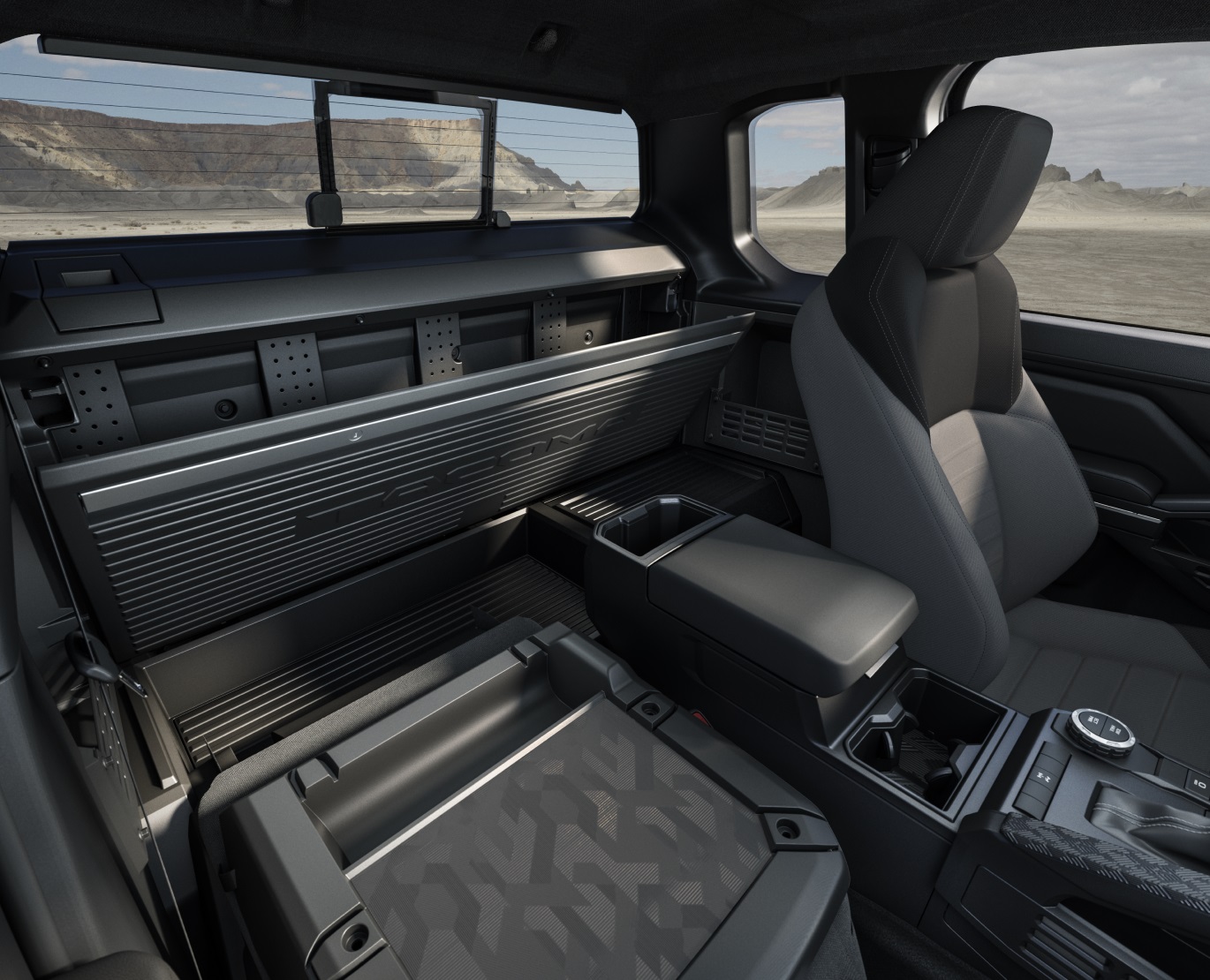 La batería no está en la cadena cinemática, sino en el altavoz Bluetooth JBL Flex. El altavoz está integrado en el salpicadero de algunas versiones del Tacoma y puede desplegarse para su uso externo, y puede conectarse con altavoces JBL similares.