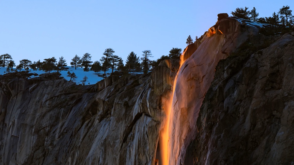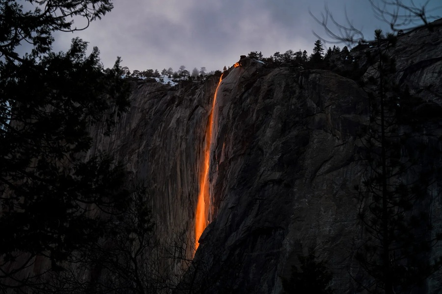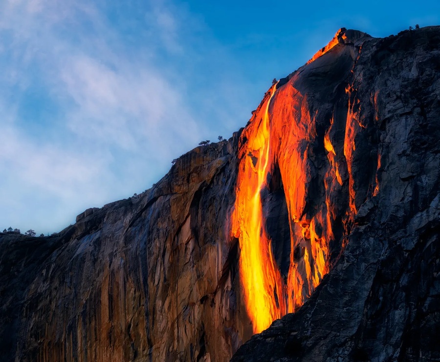 Fire Waterfall, en Yosemite, es el mismo Horsetail Fall bajo luz crepuscular que convierte el agua en fuego líquido, con un flujo naranja que ilumina la noche como un portal al averno, durando 10 minutos en febrero.