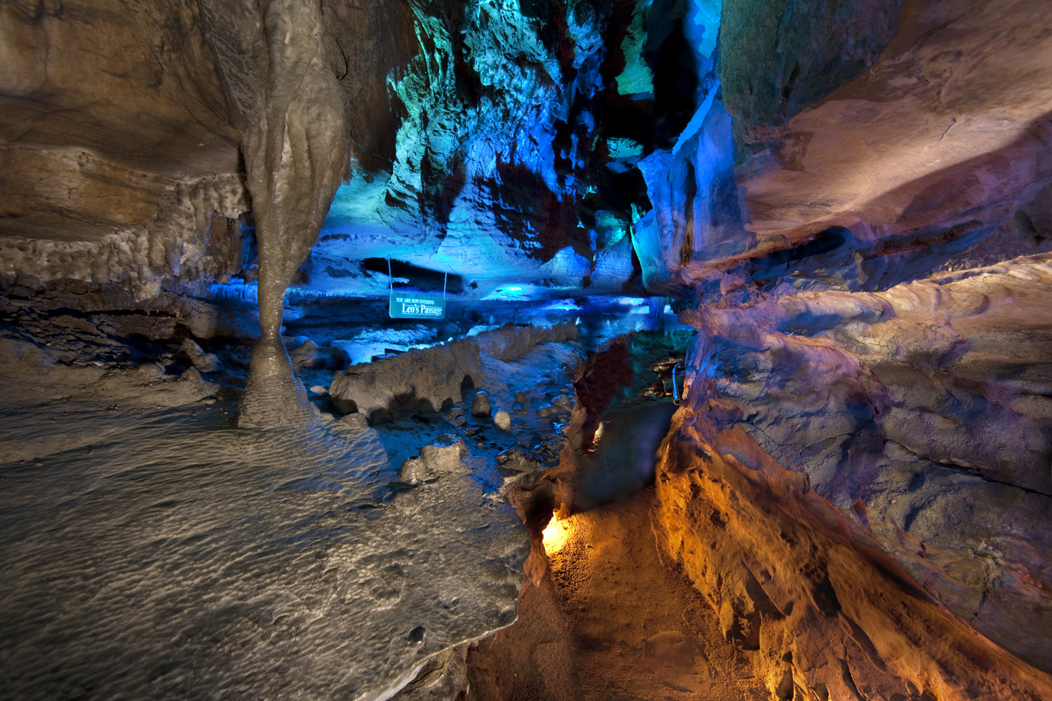 El viaje comienza con un ascensor de cristal que desciende 26 pisos hasta el corazón de la montaña. En la parte inferior, los visitantes verán una serie de estalactitas, estalagmitas, formaciones antiguas y, por supuesto, Ruby Falls, que se encuentra a 1.120 pies dentro de Lookout Mountain.