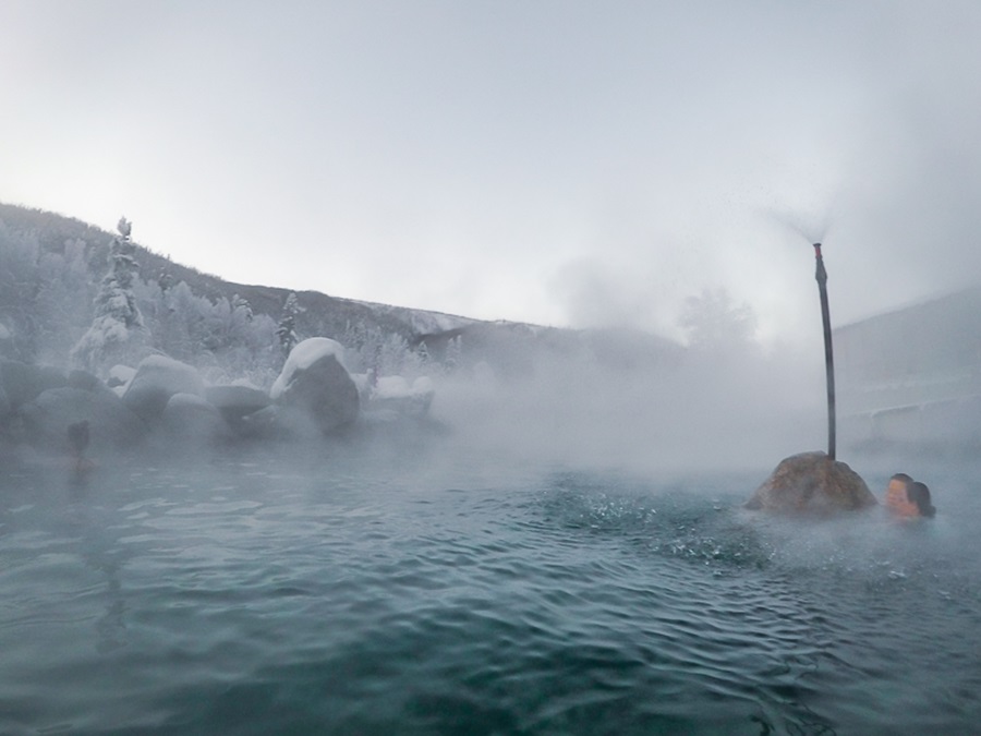 Los visitantes pueden sumergirse en sus aguas de 104°F, con la posibilidad añadida de presenciar auroras boreales. El complejo ofrece varias alternativas para el disfrute acuático, como bañeras cubiertas y al aire libre, jacuzzis y una piscina cubierta.