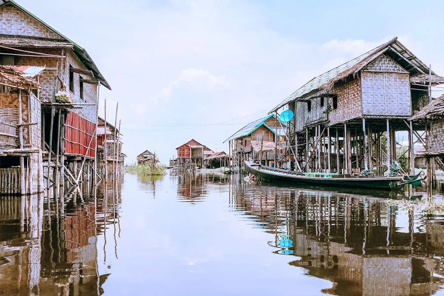 Inle Lake, en Shan State, Myanmar, comprende 17 hamlets flotantes como Yawnghwe, con 70,000 habitantes en palafitos de bambú sobre el segundo lago más grande del país, donde pescadores usan la técnica de remo con pierna para equilibrar redes, cultivando tomates flotantes y vendiendo en canoas que chocan con un ritmo hipnótico.