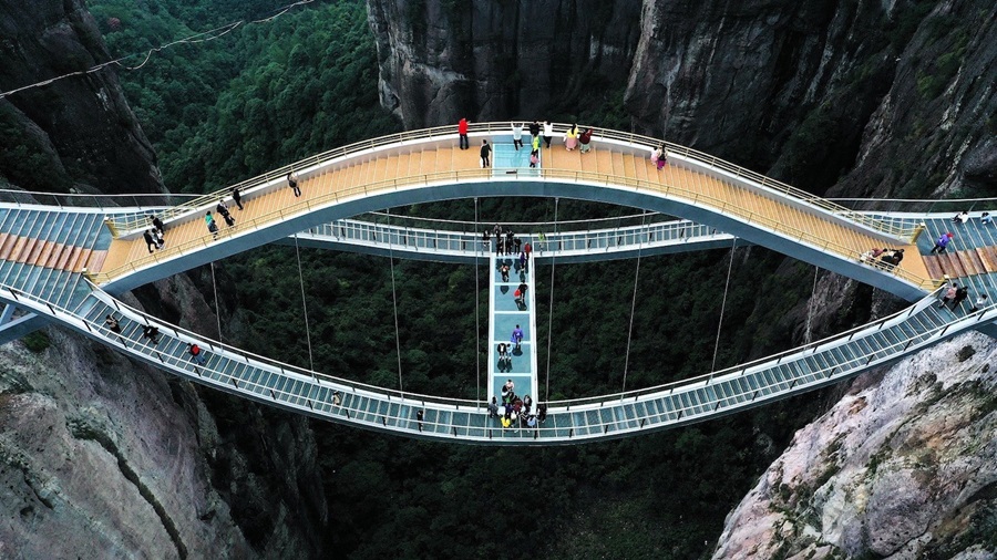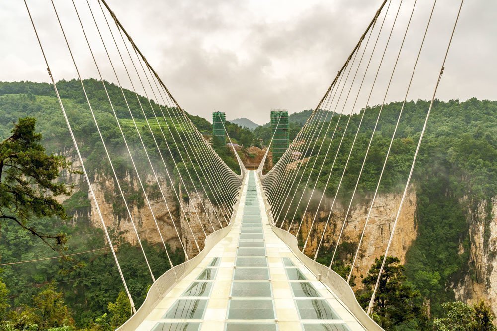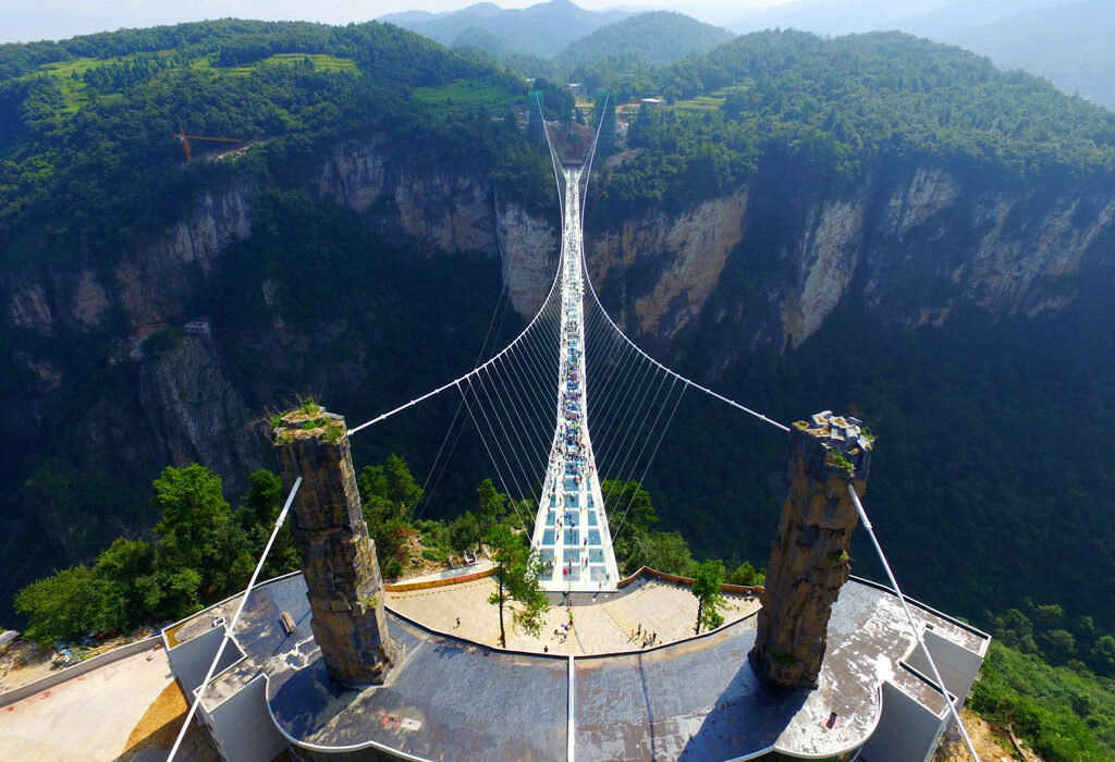 ¿Por qué impresiona? Es el puente peatonal de cristal más largo y alto del mundo. Se extiende 430 metros de largo y 6 metros de ancho, flotando sobre un desnivel de 300 metros entre dos acantilados. Todo el tablero está compuesto de vidrio transparente.