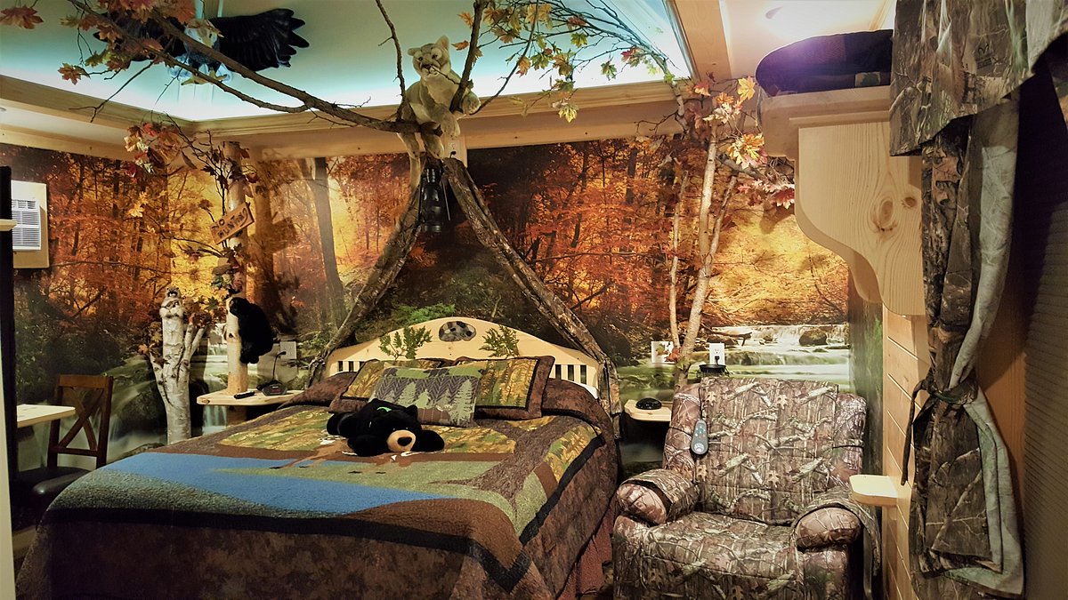 En Bear Cove Inn, los huéspedes pueden «dormir bajo los árboles» en las distintas habitaciones temáticas del hotel, decoradas con papel pintado, cortinas, ropa de cama y otros elementos decorativos inspirados en la naturaleza. Si lo que busca es una escapada «natural», alójese en la cabaña «Bear-Themed Cottage», equipada con dos sillones reclinables con calefacción y masaje.